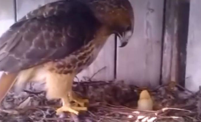Через певний час орленя вилупилось у курки, а курча з’явилось в орлиному гнізді. Реакція хижого птаха змусила фермера включити камеру: орел явно не міг зрозуміти, що не так з його потомством.